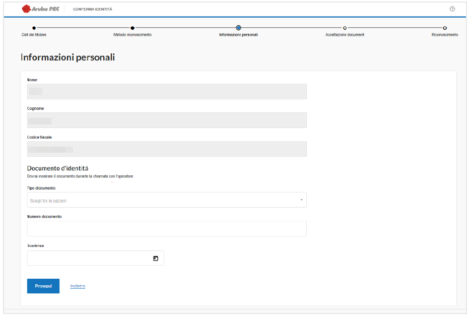Il sistema proporrà la schermata con il riepilogo delle informazioni personali del Richiedente. Quest’ultimo, verificata la correttezza dei dati anagrafici, dovrà registrare gli estremi di un proprio documento di identità in corso di validità, tra quelli ammessi ed elencati nel relativo menù a tendina: