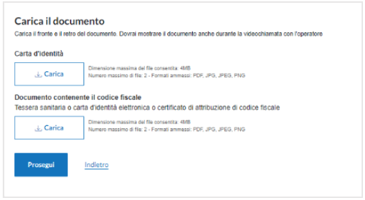 Dopodiché provvedere al caricamento della scansione/fotografia del fronte e del retro del documento di identità e della tessera sanitaria (o documento equipollente). Quest’ultima non è richiesta in caso di upload della copia della CIE.