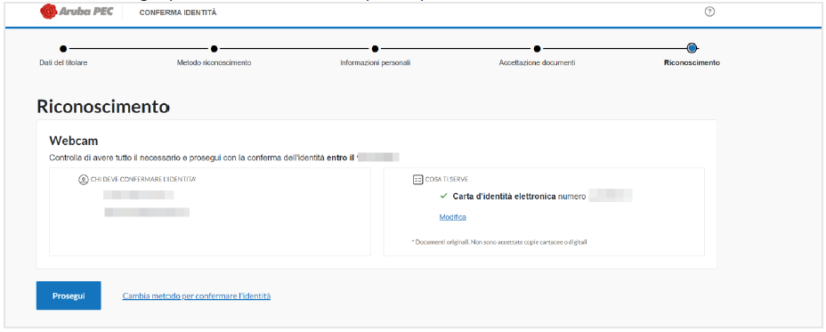 La piattaforma per il riconoscimento proporrà una pagina riepilogativa delle informazioni inserite. Cliccando sul pulsante Procedi si accederà all'identificazione mediante videochiamata.
